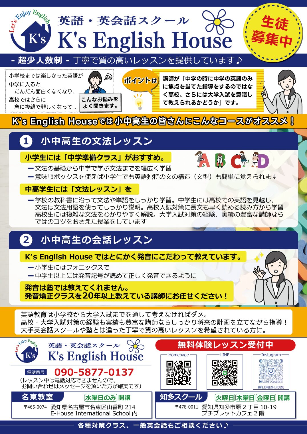 愛知県知多市、名東区、尾張旭市、の3教室大手英会話スクールや塾とは少し違う、丁寧で質の高いレッスンを提供しています♪ 生徒募集中!! 大手スクール勤務25年の超ベテランスーパー講師が上達をしっかりサポート。アメリカで学生時代を過ごした講師なら英会話もネイティブ並み!とにかくたくさん話せて楽しいから上達も早い英会話クラス。超少人数の対面レッスンなのでしっかり理解できる文法クラス。高校、大学入試対策の経験、実績も豊富な超ベテラン講師だから各種対策クラスもお任せください!4つのレッスンから「こだわり」をチェック!まずは無料体験レッスンで「こだわり」を実際に体験してみませんか? K’s English House は愛知県内3ヶ所の教室でレッスン中! ◎ 東海市八幡新田駅前の「知多スクール」 ◎ 名古屋市名東区の東山動植物園近くの「名東教室」 ◎ 尾張旭市の「尾張旭教室」 文法クラスや各種対策クラスから会話まで。グループレッスンでも1クラス最大4人までの超少人数クラス。 ベテラン講師ならではの細かいところにまでこだわりの詰まったレッスン。お気軽にお問い合わせください♪ 各教室の現在募集中クラス 知多スクール 毎週火曜日、木曜日、金曜日小学生から一般まで全レッスン募集中! 名東教室 毎週水曜日17:00〜,18:10〜,19:20〜の学年別中学生文法クラス、中学校準備クラス高校生クラスもご相談ください! 尾張旭教室 毎週月曜日 小4英会話クラス、中学生文法クラス若干名募集中! スクールからのお知らせ、お得な情報、最新情報は是非ブログをご覧ください! \ 希望や弱点に合わせて選べる / 小学生からシニアの方まで! あなたにピッタリな 4 つ の Lesson コース 各レッスンの「こだわり」ポイントを「詳細」から要チェック! 一般英会話レッスン詳細&こだわりはこちら > 小中高生の英会話レッスン詳細&こだわりはこちら > 小中高生の文法レッスン詳細&こだわりはこちら > オーダーメイドプライベートレッスン詳細&こだわりはこちら > ご利用者の声 保護者① ワガママな対策レッスンをいつもお願いしています。英検の二次試験の対策や子供の志望校合格のためのオリジナル対策レッスンをお願いできるのも、経験豊富な先生だから。困った時に頼りになる先生。志望校にも無事合格! 保護者② 中学生のうちの娘は英語に限らず習い事で先生のことを家で話題にしたことは一度も無かったんですが、しのぶ先生のレッスンに関しては“今日の先生すごく分かりやすい。めちゃいい”なんて帰り道で言い出したくらい。先生とは気が合うようで何でも話しているみたい。これまで定期テストでも60点くらいだったのに前回のテストでは90点台をクリア。まだレッスン受け始めて1年未満なのに。英語嫌いだったのに英検も自分から受けるって。しかも合格!本当に感謝です 生徒① 小さい頃から習ってたおかげで外国人の人とも難なく話せると思ってたんです…でもしのぶ先生のレッスンを受けたら、今まで言われたことのない、でも言われたら納得しかない鋭い指摘を受けて、長年感じたことがなかった上達を久しぶりに実感しました。発音矯正クラスで発音も綺麗に。帰国子女みたいって言われます。発音記号も読めるようになったからどんな単語も正しく読めます! 講師紹介 しのぶ先生 高校・大学時代をアメリカ、コロラド州で過ごす。英会話力はネイティブ並み。大手英会話スクールに25年勤務したレジェンド講師!誰もが笑顔になる英会話クラスから、どんなに英語が嫌いな子でも分かりやすい文法クラス。各生徒さんに足らない力をすぐに見極められるから、しっかり弱点を補強して上達の実感できるレッスンでは定評あり。オーダーメイドの各種対策クラスもスーパーベテラン講師にお任せください!それぞれの生徒さんにピッタリ合わせたレッスンはまさに職人の匠の技!! 2026年春スタート!開校日パワーアップ✨ 2025年12月3日 ブログ 🌸知多スクールでは来春から開校日が増設! […… ✨楽しかった夏休みクラフト教室✨ 2025年8月9日 ブログ 2日間にわたって開催したクラフト教室「英 […… クラフト教室でお待ちしていますね〜✨ 2025年8月5日 ブログ 今週末は夏休み恒例のクラフト教室です。 […] MORE アクセス 【知多スクール】 〒478-0011 愛知県知多市原2丁目10-19 プチブレットカフェ2階 【名東教室】 〒465-0074 愛知県名古屋市名東区山香町214 E-House International School内 【尾張旭教室】 〒488-0083 愛知県尾張旭市旭ヶ丘町旭ヶ丘 5726-18 アトリエBEE お問い合わせ 無料体験レッスン受付中! 090-5877-0137 ks.english.house@gmail.com 川角しのぶ (Shinobu Kawasumi) お問い合わせフォーム ※レッスン中は電話応対出来ませんのでメール、LINEでのご連絡が確実です