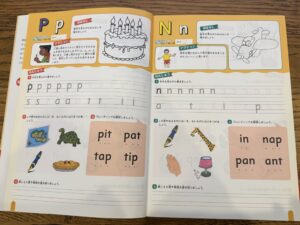 ワークブックでは書く練習をした後、先生が読む単語の中にその日に学習した音が入っているかどうかを聞き取る問題や、