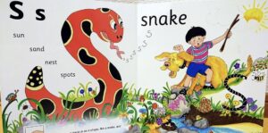 私のスクールで使用しているフォニックスの教材では、まず絵を見ながら先生の読むお話しを聞くことからその日の学習がスタート。